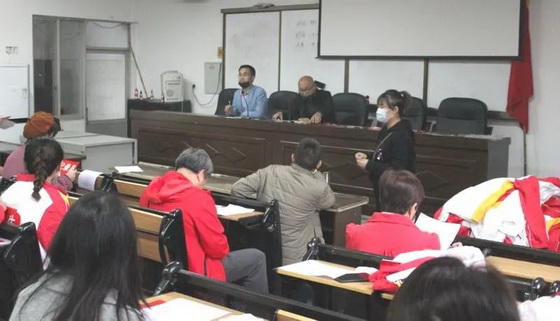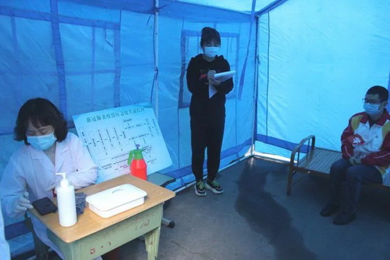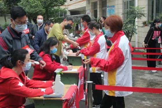 3月27日上午10时,数十名“学生”走进自贡六中的校门,4位检测员和4位记录员分别检测体温、做好记录、给“学生”双手喷洒酒精消毒。
